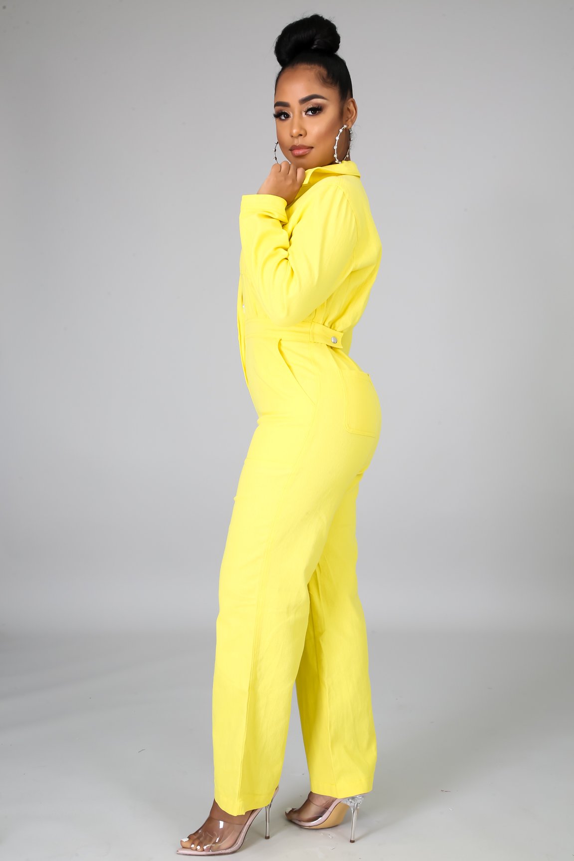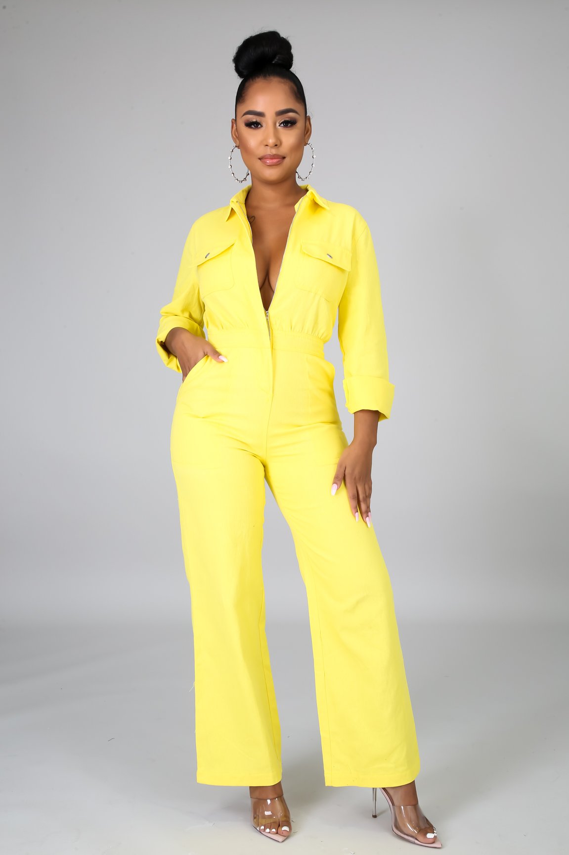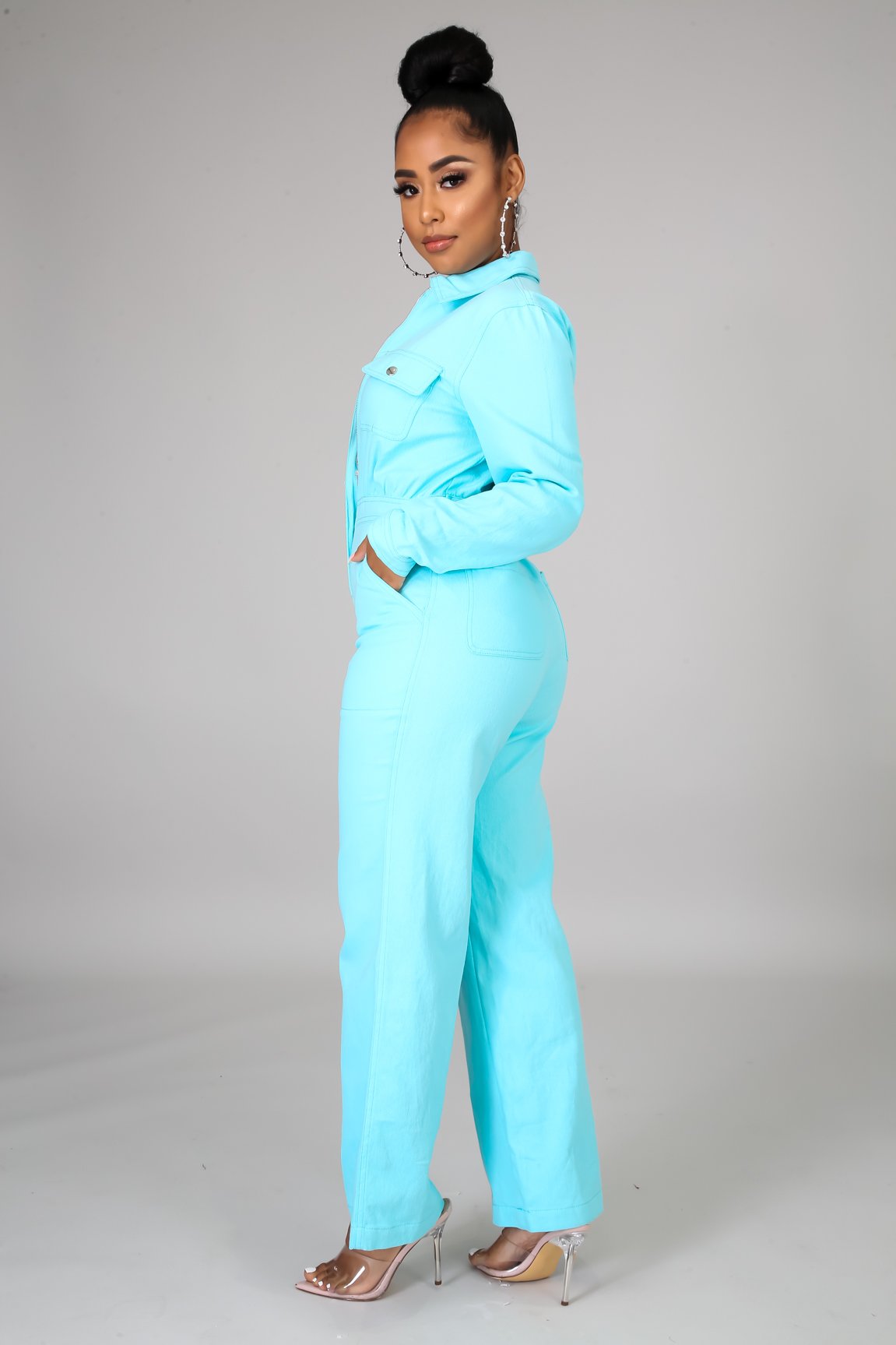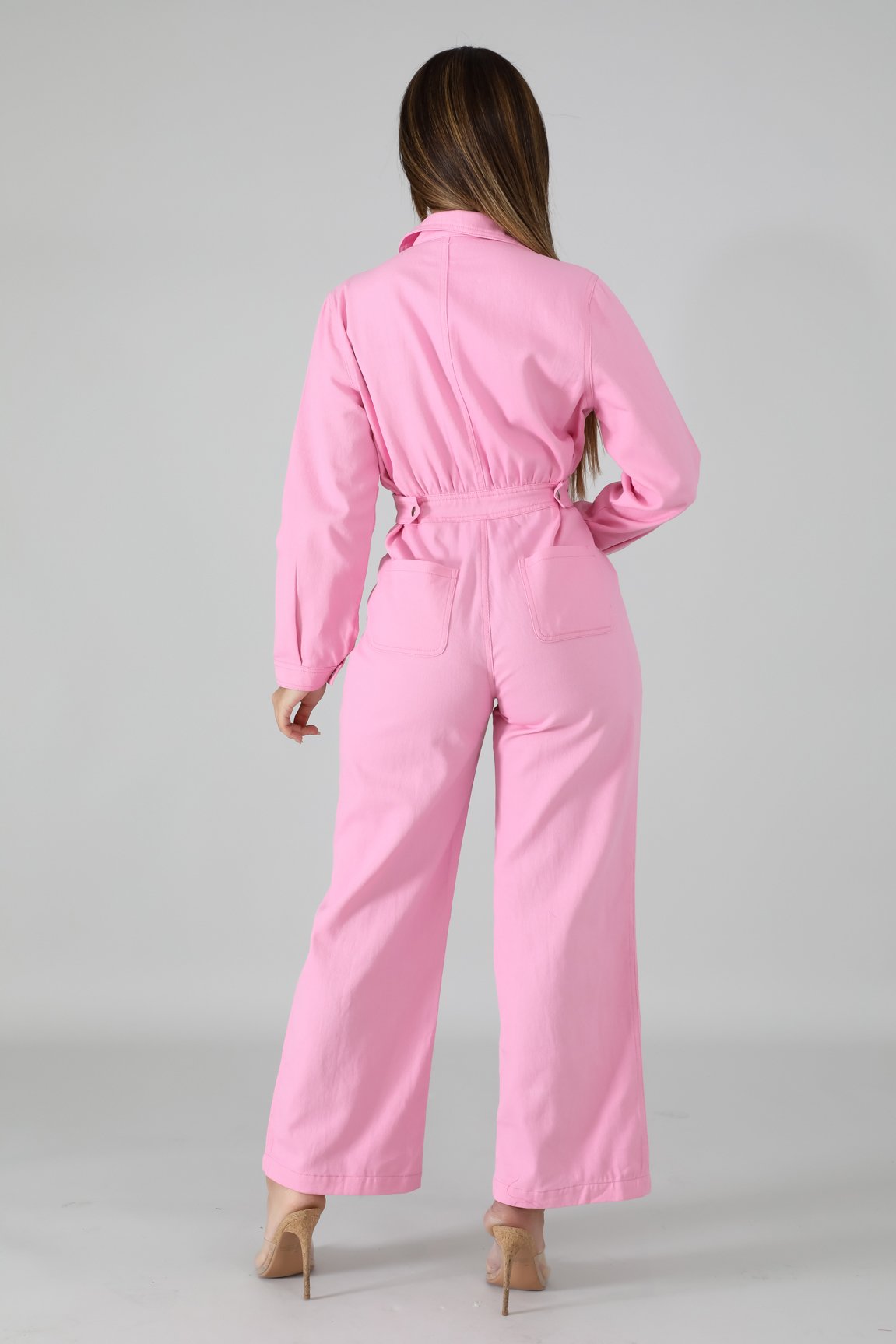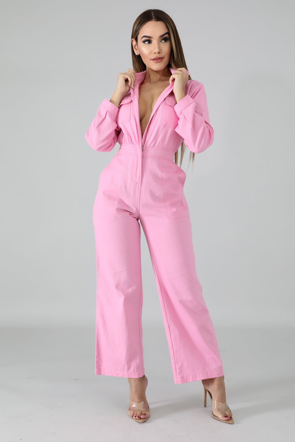 This denim rustic jumpsuit features, a non-stretch fabric, collard neckline, long sleeves, side pockets, finished with a front zipper closure.