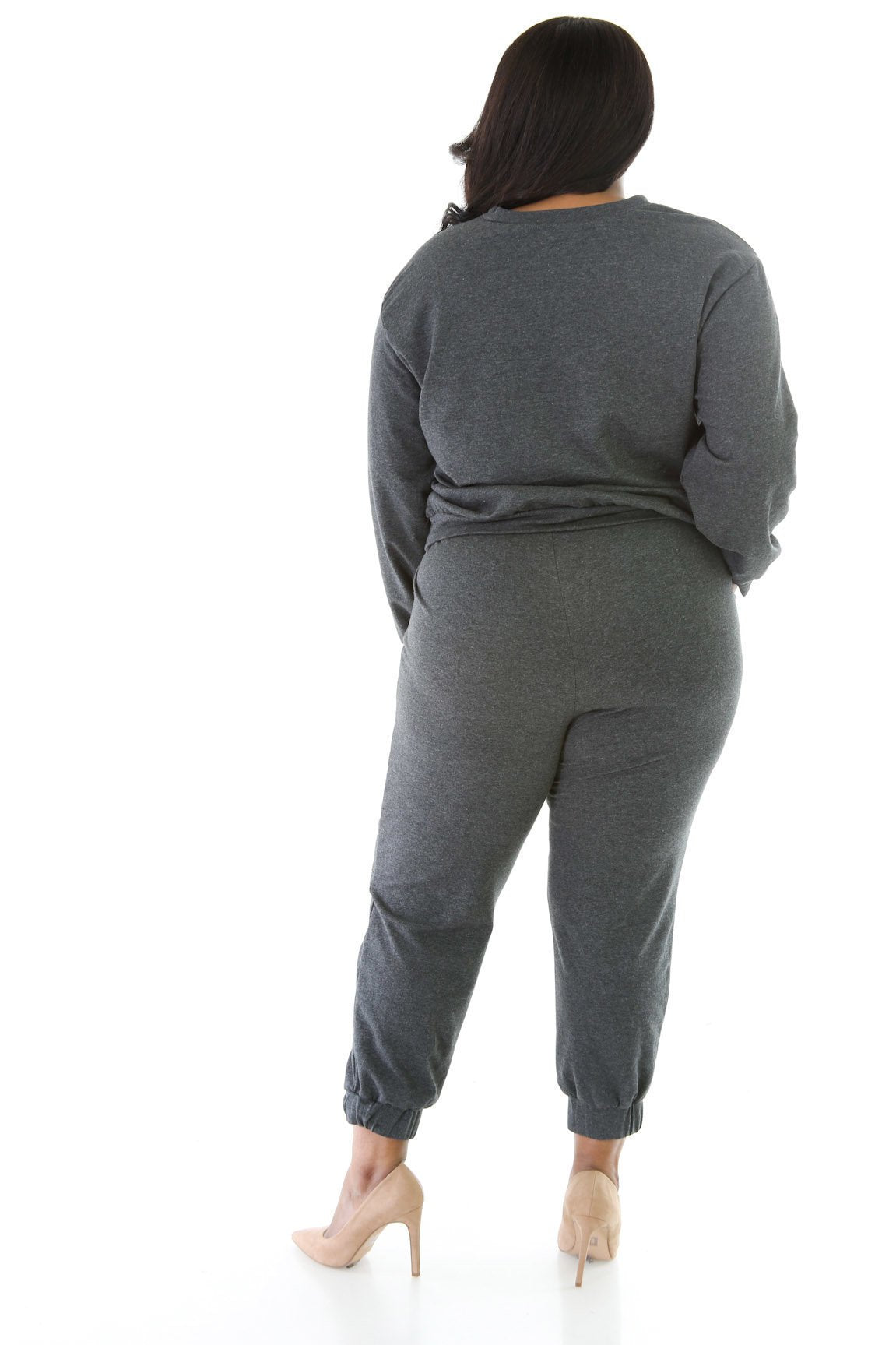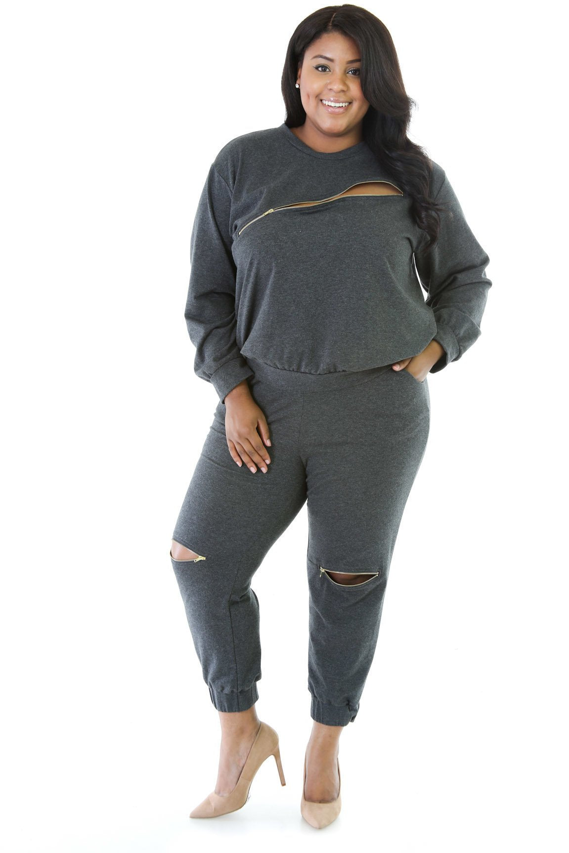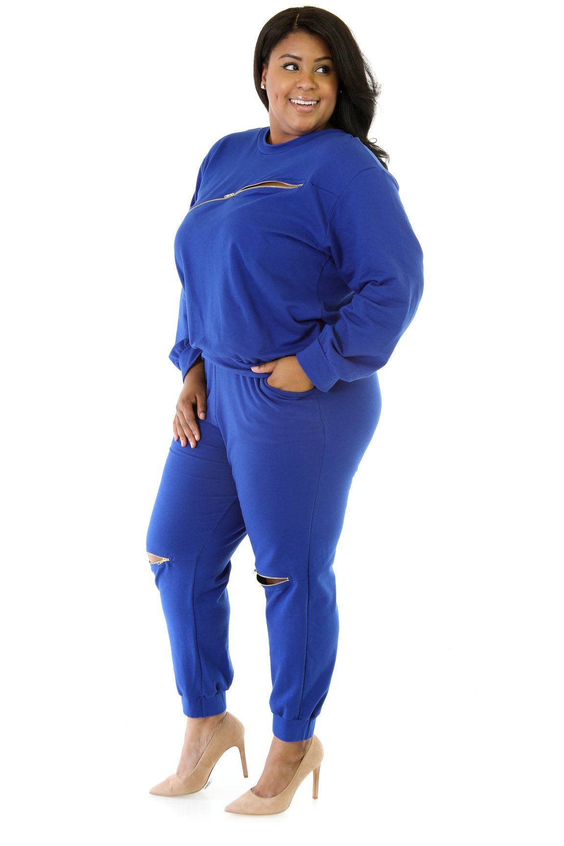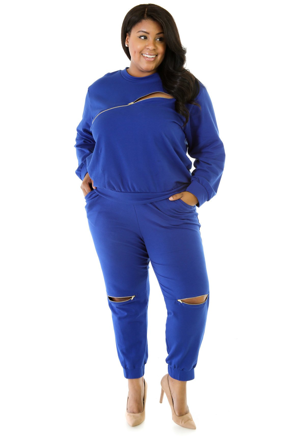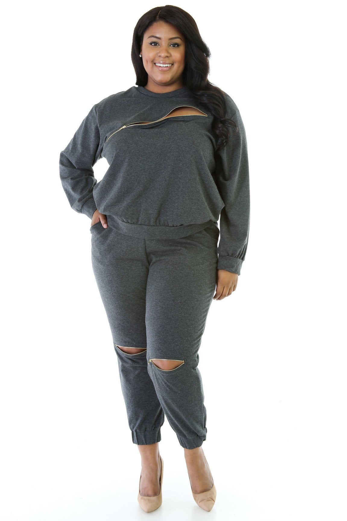 Look cool and styling this time of year in this popular set.This set features a soft stretchy fabrication throughout; top has a round neckline, long sleeves, and asymmetrical zipper at front; bottom has a thick elasticized waistband, non-adjustable self-tie string, cuffed ankles, and zipper at knees.