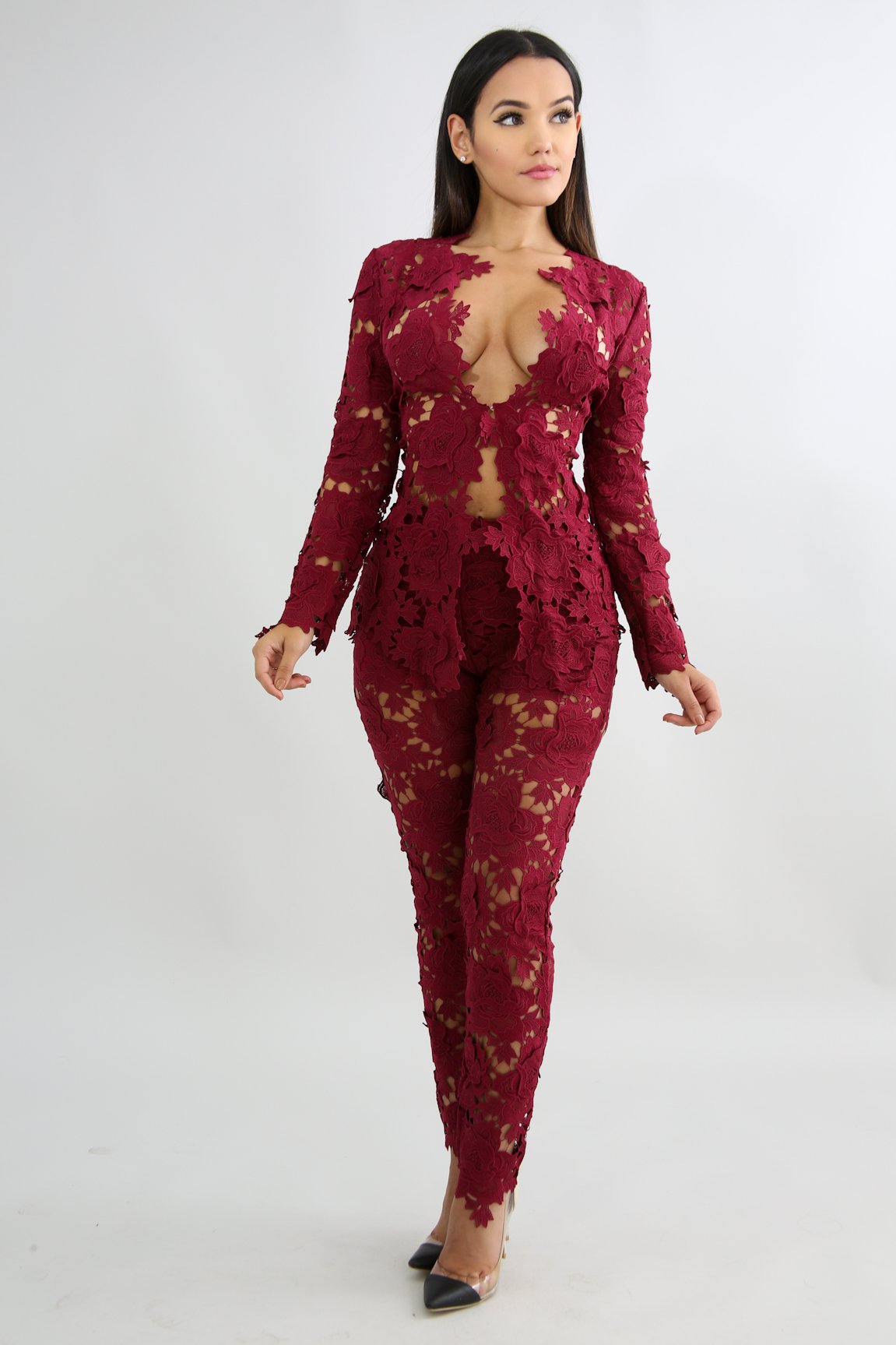 This barbie crochet pant suit set features, a non-stretch fabric, long sleeve blazer, clip on front closure, high waist underlined pants, finished with a hidden side zipper closure.
