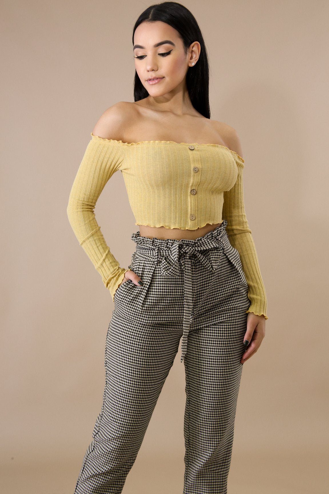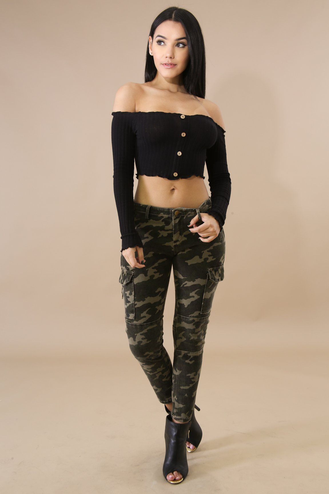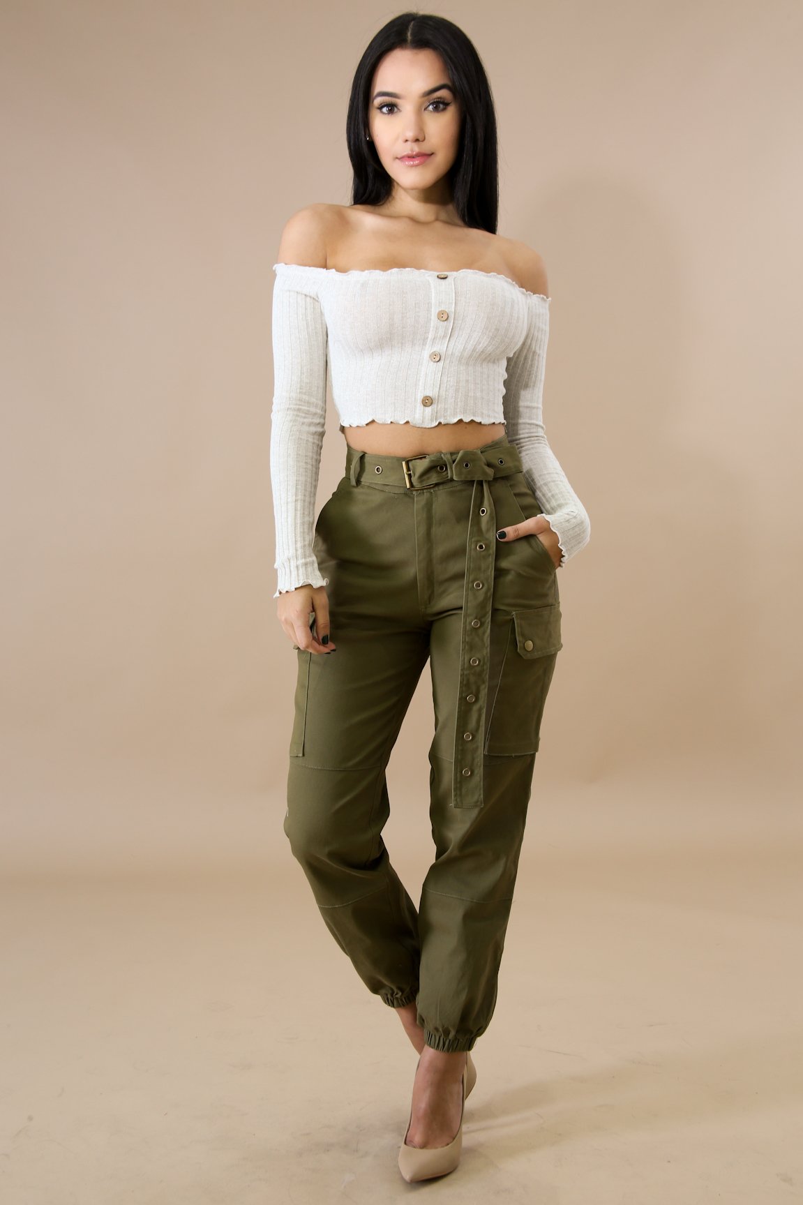 This scallop button crop top features, a stretchy fabric, long sleeves, off shoulder neckline, front button detail, no closures.