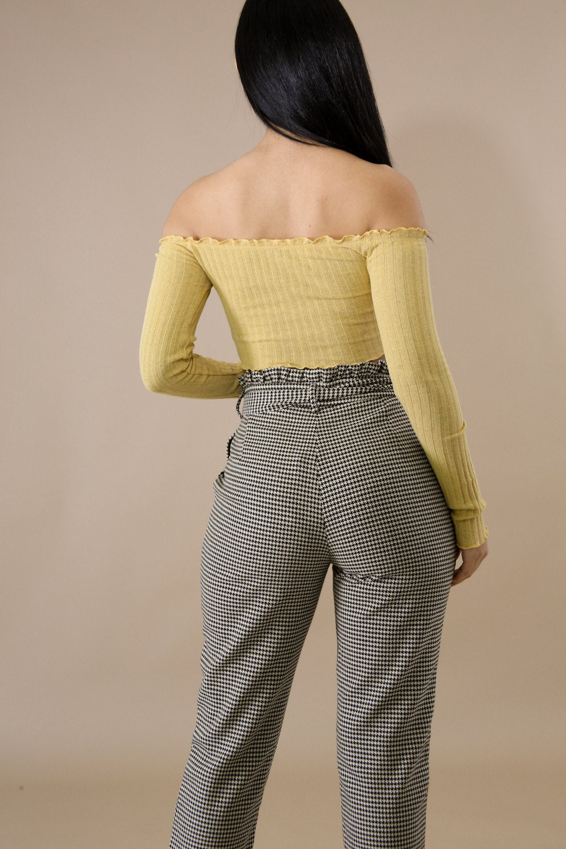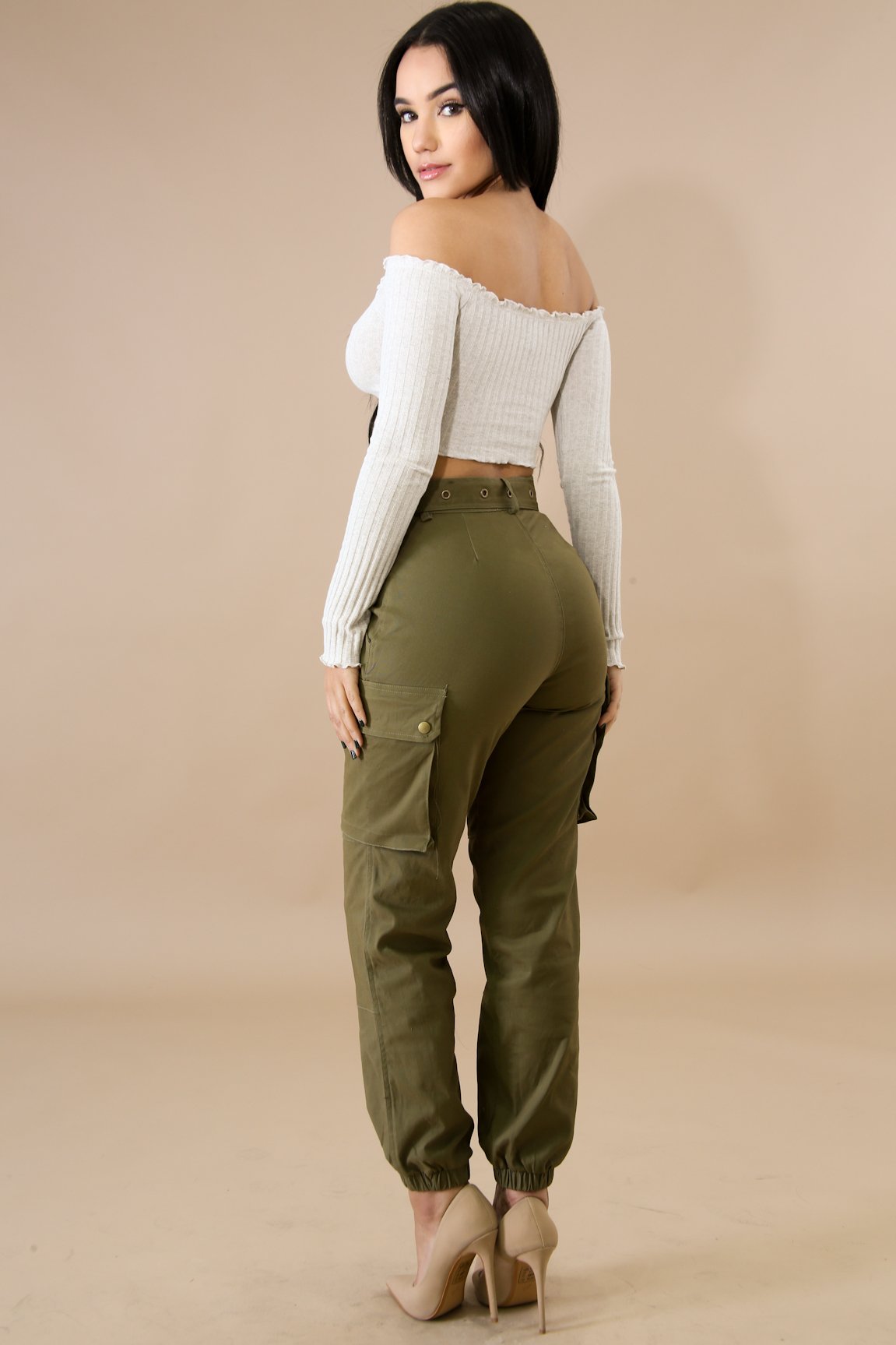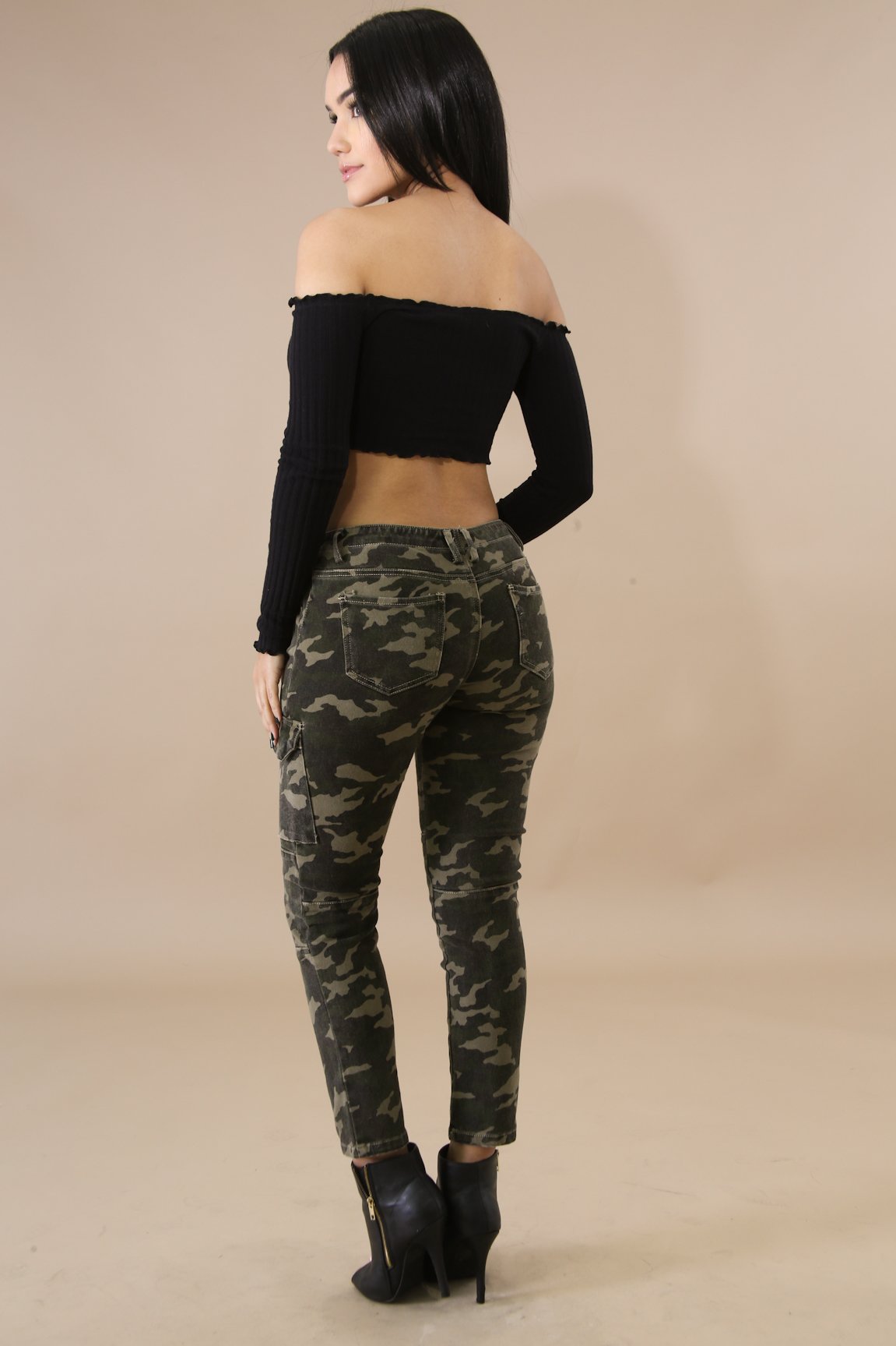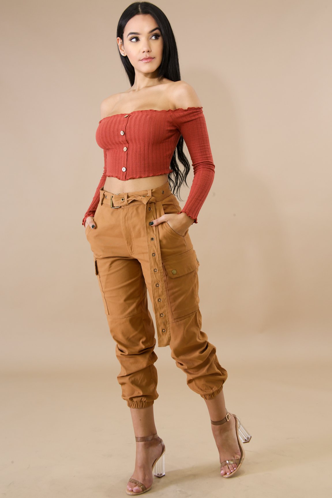 This scallop button crop top features, a stretchy fabric, long sleeves, off shoulder neckline, front button detail, no closures.