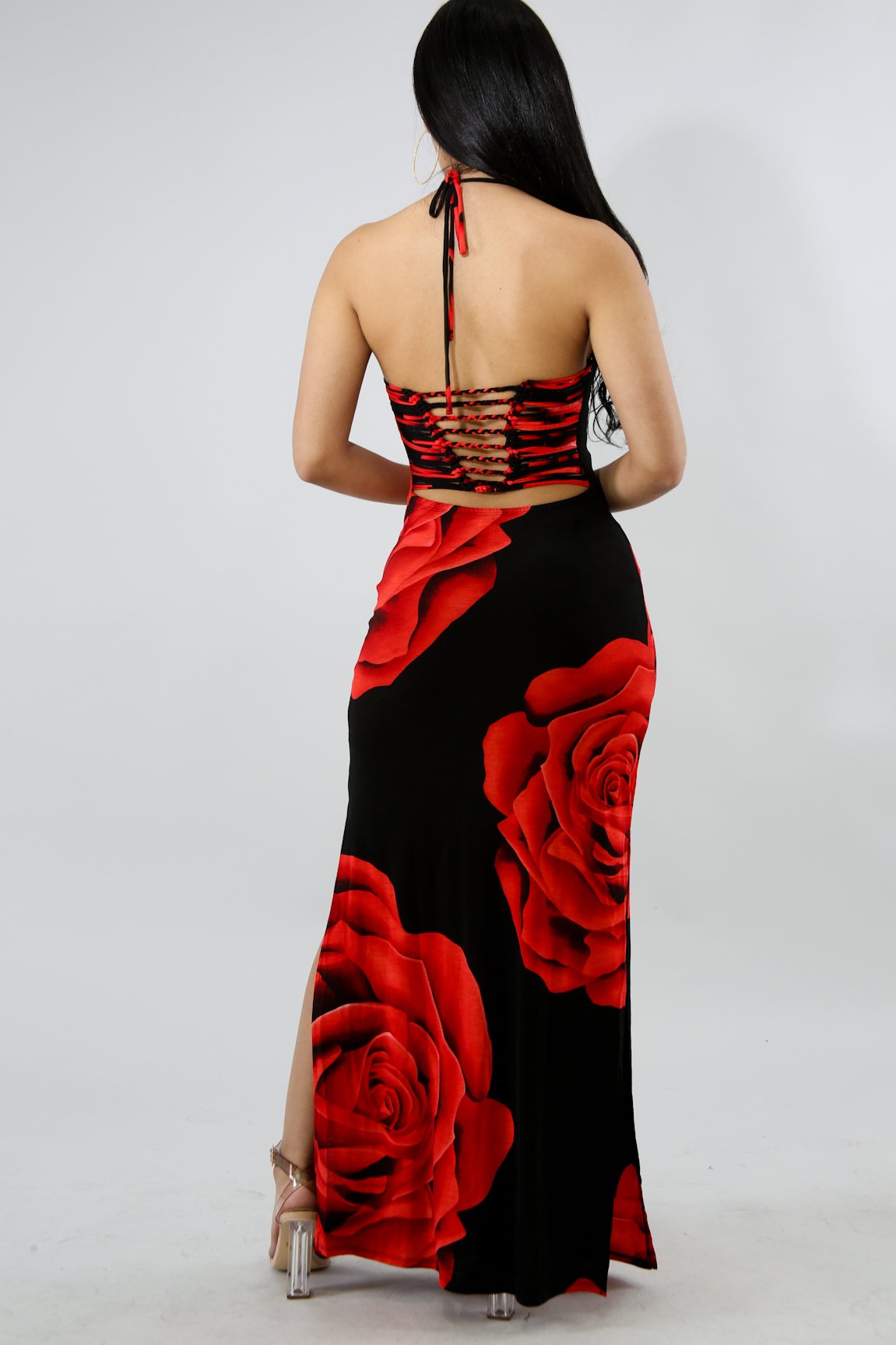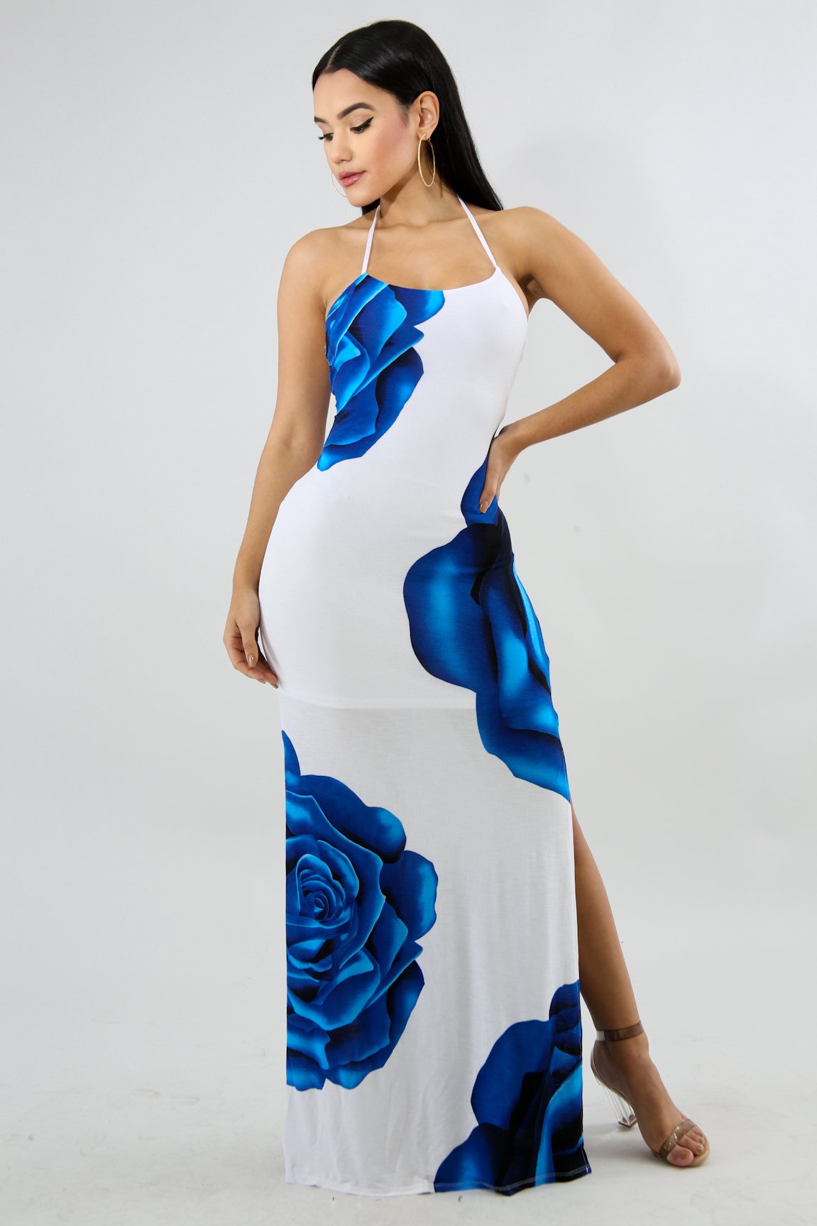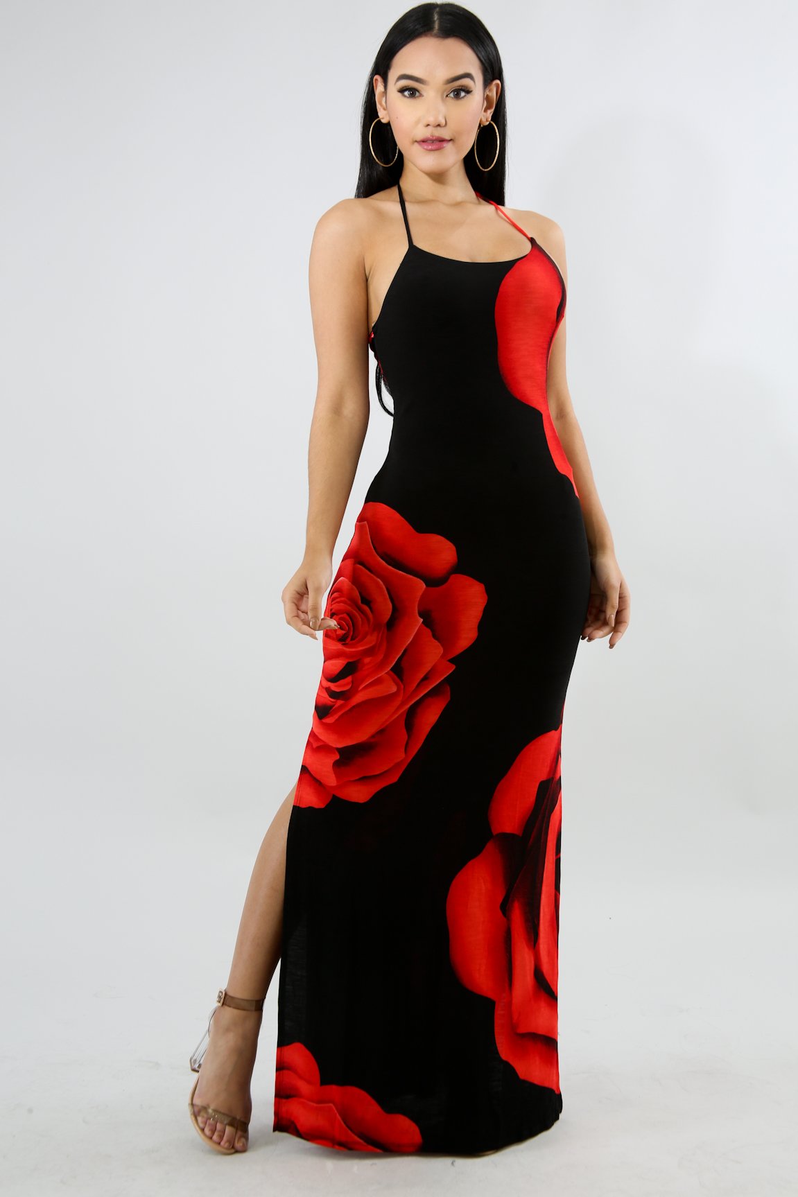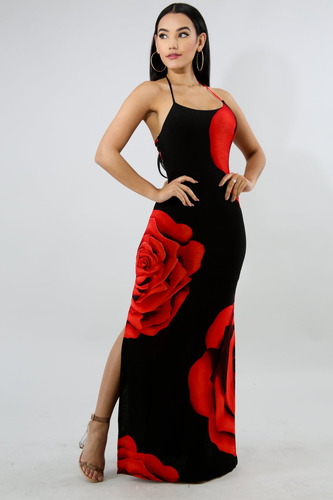 This rose slit spring dress features, a stretchy fabric, underlined, self tie shoulder straps, round-neckline, cut out back, with braided detail, side slits, no closures.