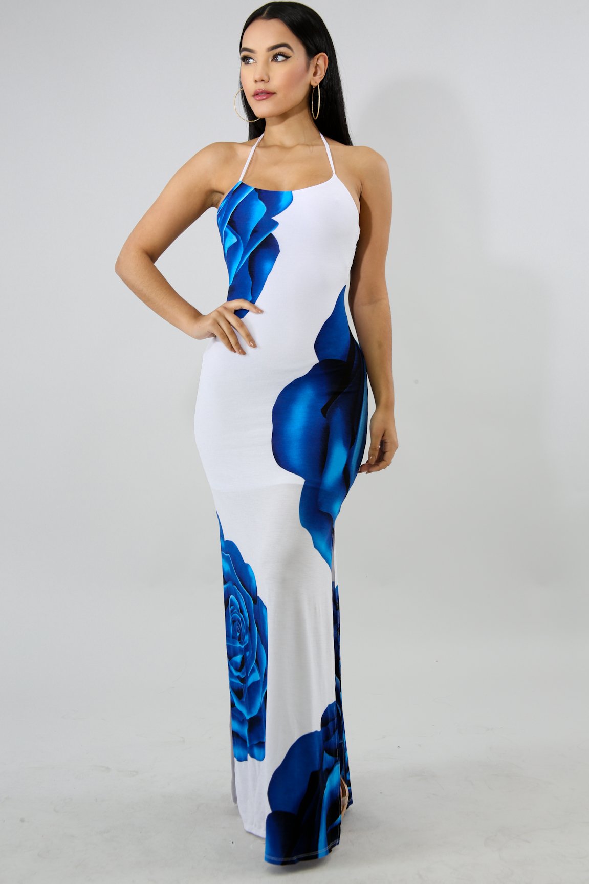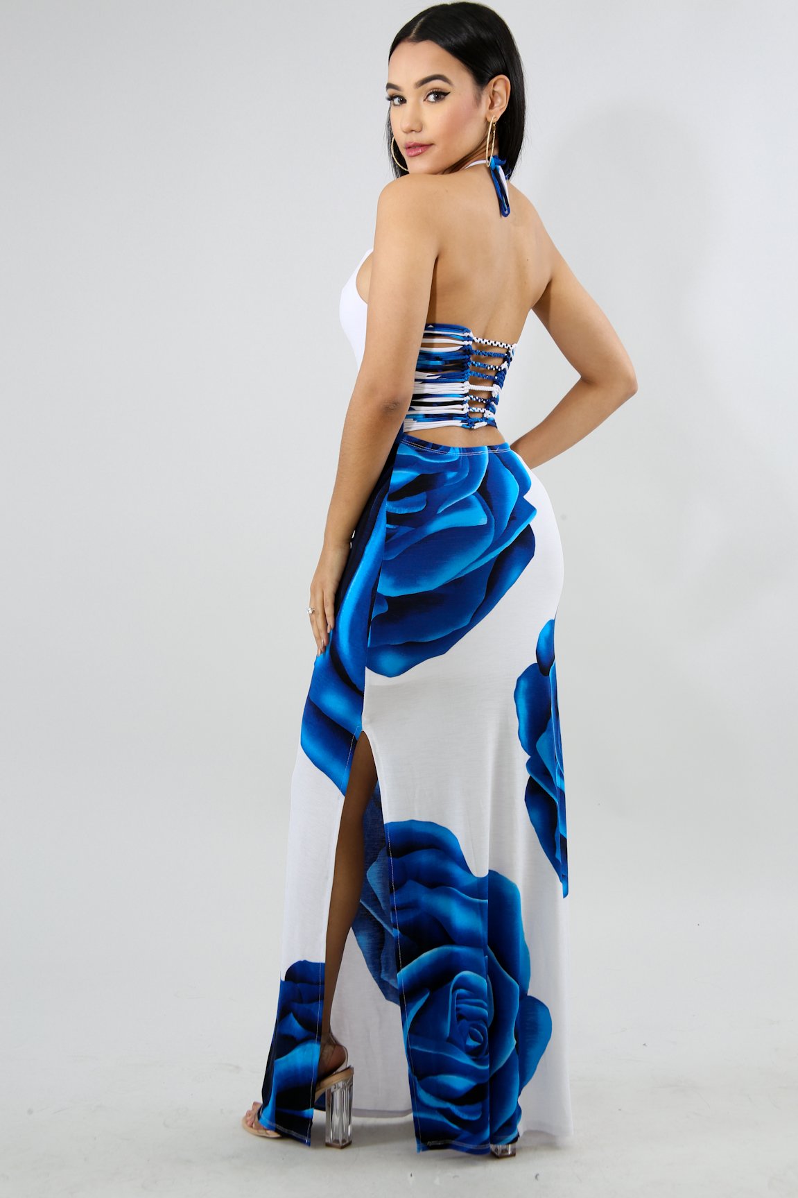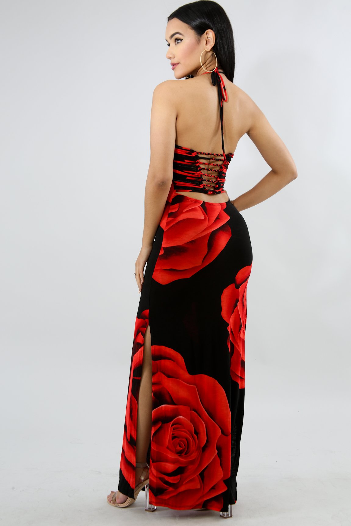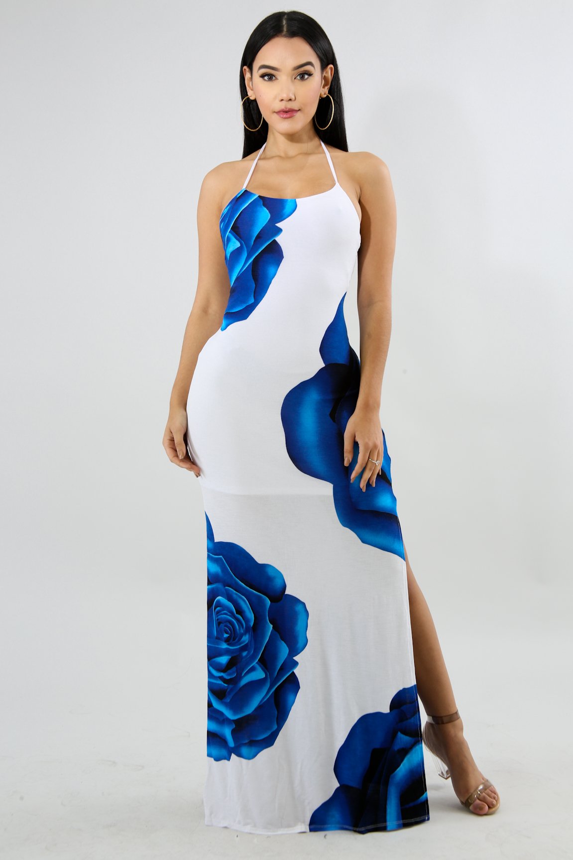 This rose slit spring dress features, a stretchy fabric, underlined, self tie shoulder straps, round-neckline, cut out back, with braided detail, side slits, no closures.