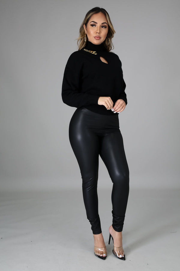 Style MT1236 Stretch sweater Long sleeve Turtle neck Chain detail 50% viscose 28% polyester 22% polyamide model is wearing a Small This Item Is Final Sale! MODEL STATS Height: 5.5"Bust:34" / Waist:26" / Hips:39"
