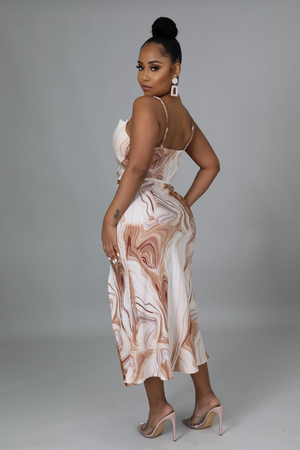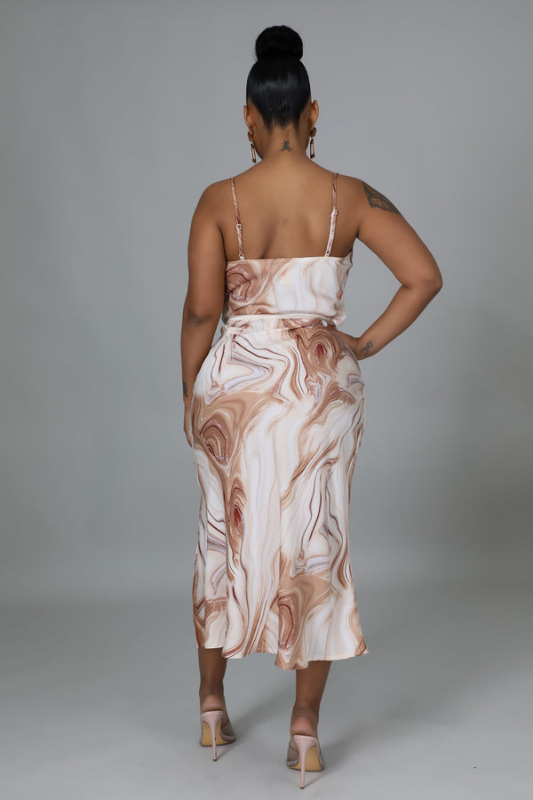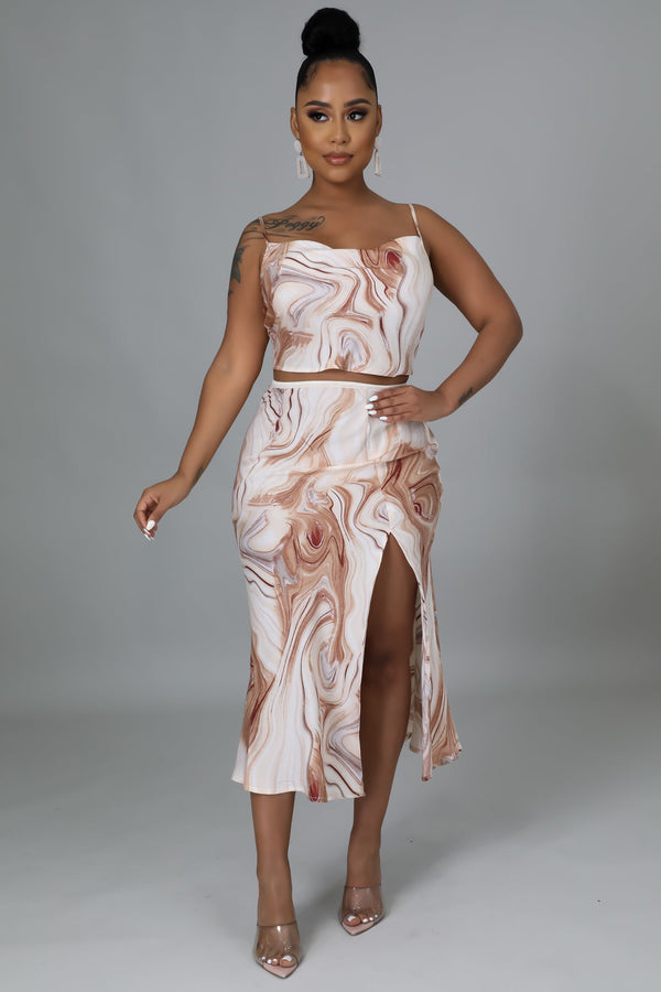 Style 1873/755  Two piece set  Crop top  Sleeveless No closure  High waisted skirt  Elastic waistband   Slit  100% polyester  5% spandex  Hand wash cold  Model is wearing a small MODEL STATS Height: 5.6"Bust:34" / Waist:25" / Hips:41"