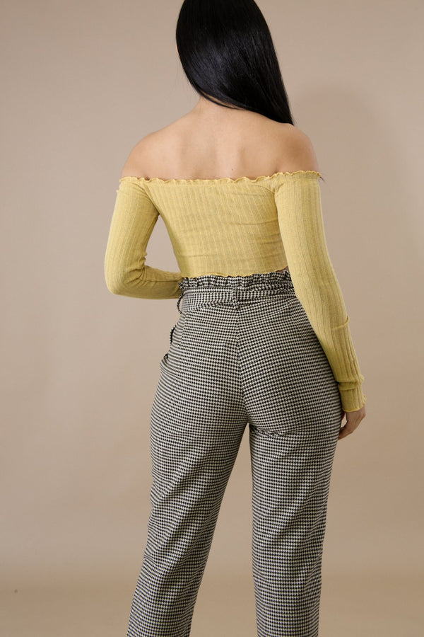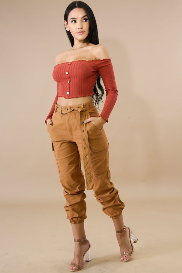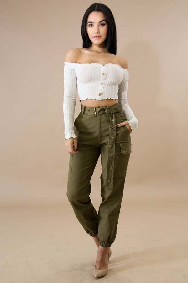 Style 1920 Description This scallop button crop top features, a stretchy fabric, long sleeves, off shoulder neckline, front button detail, no closures. Model is wearing a small This Item Is Final Sale! 94% Cotton 4% Spandex 2% Polyester Hand wash...