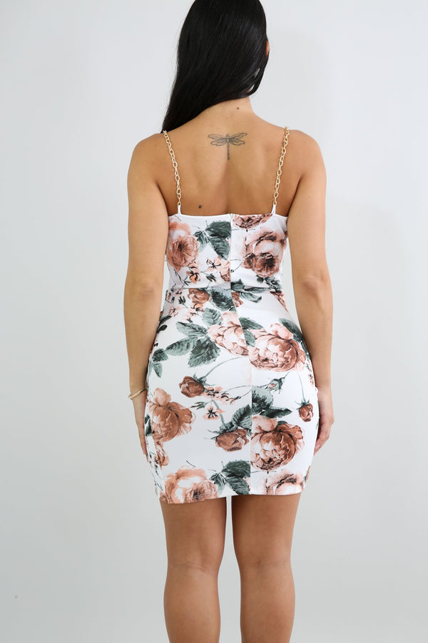 Style 2893 Description This chain floral body-con dress features, a stretchy fabric, v-neckline, sleeveless, overlay scrunched front, chain shoulder straps, finished with a hidden back zipper closure. Model is wearing a small This Item Is Final Sale !! 95% Polyester...