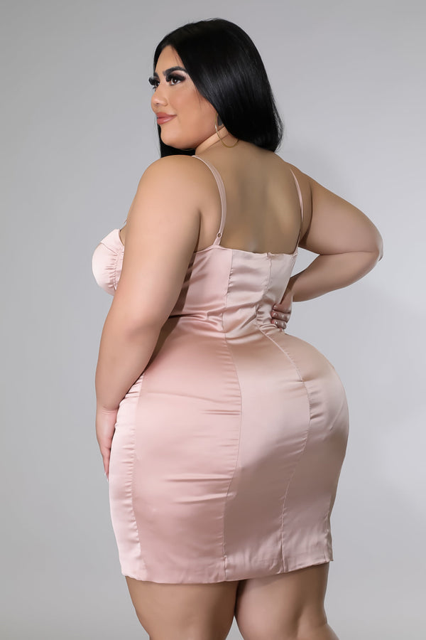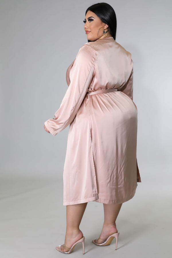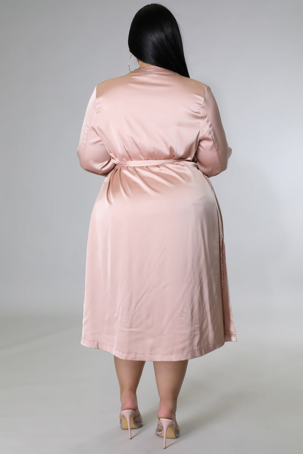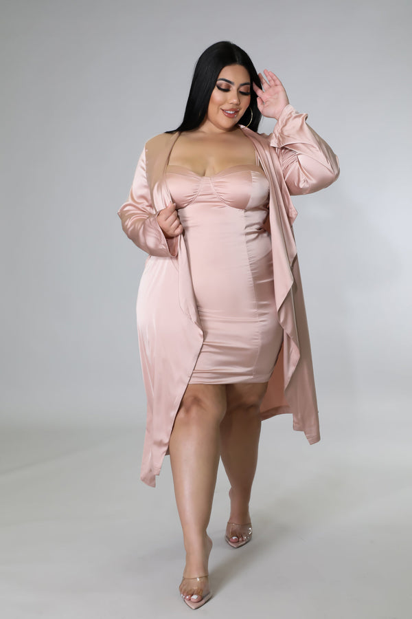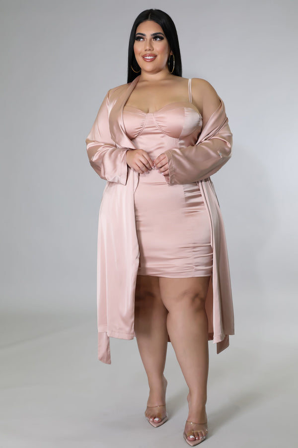 Two piece set Satin cardigan Self tie closure Satin dress Sweetheart neckline Spagetti straps Padded cups Zipper closure 97% polyester 3% spandex Hand wash cold Model is wearing a 2X Click here to get the regular size: 2pc Private Calls Dress Set...