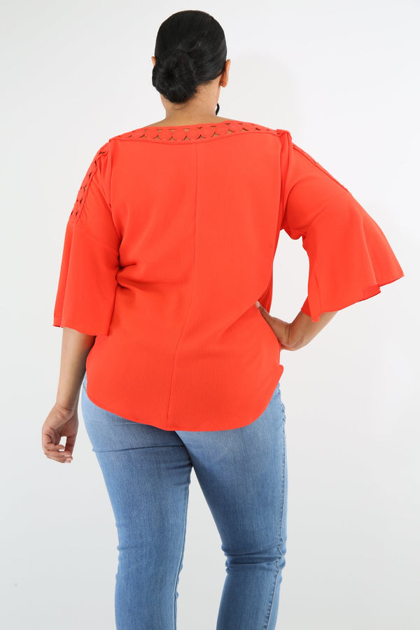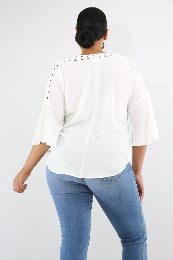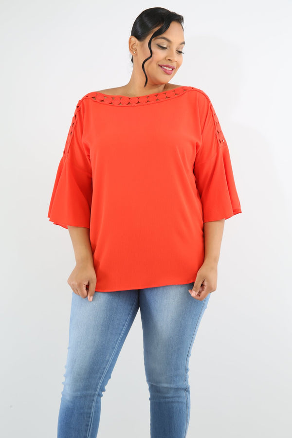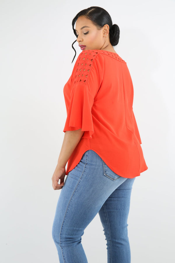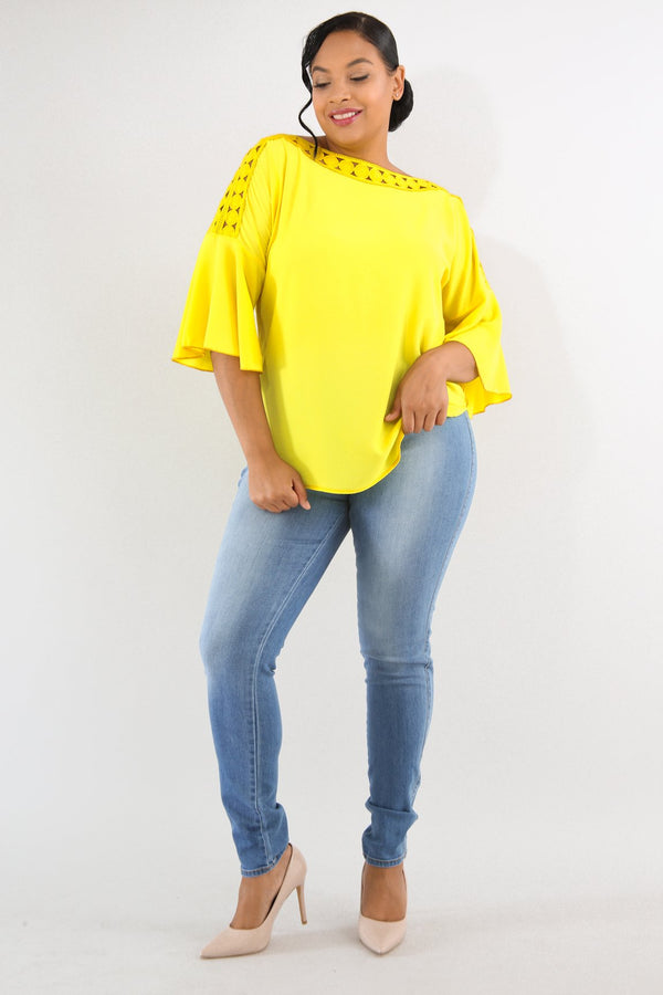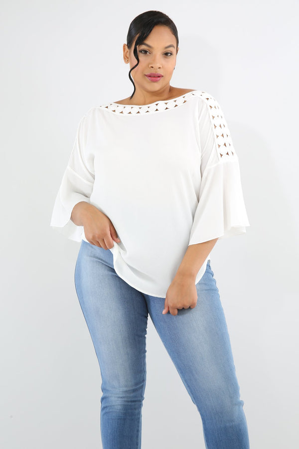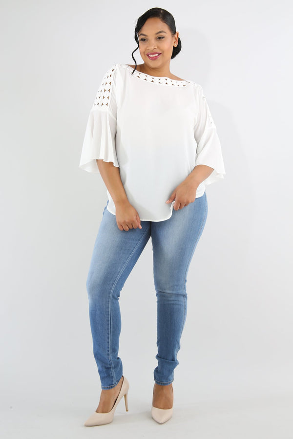 Style 6423 Description This crochet dots top features a non-stretch fabric, short flare sleeves, round crochet dots neckline, loose fit, no closures. Model is wearing 1x This Item Is Final Sale! 95% Polyester 5% Spandex Hand wash cold water Do...