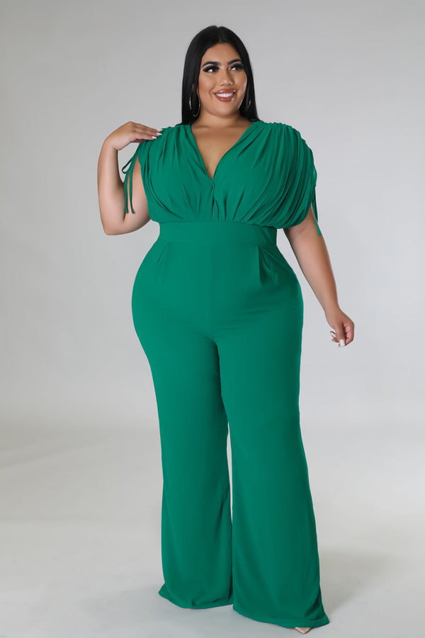 Semi-stretch jumpsuit  V neck  Short sleeves  Ruched  Drawstring  Wide legs  Zipper closure  Neck closure  100% polyester  Hand wash cold  Inseam is 33 inches Model is wearing a 2X MODEL STATSHeight: 5.6"Bust:45" / Waist:36" / Hips:54"