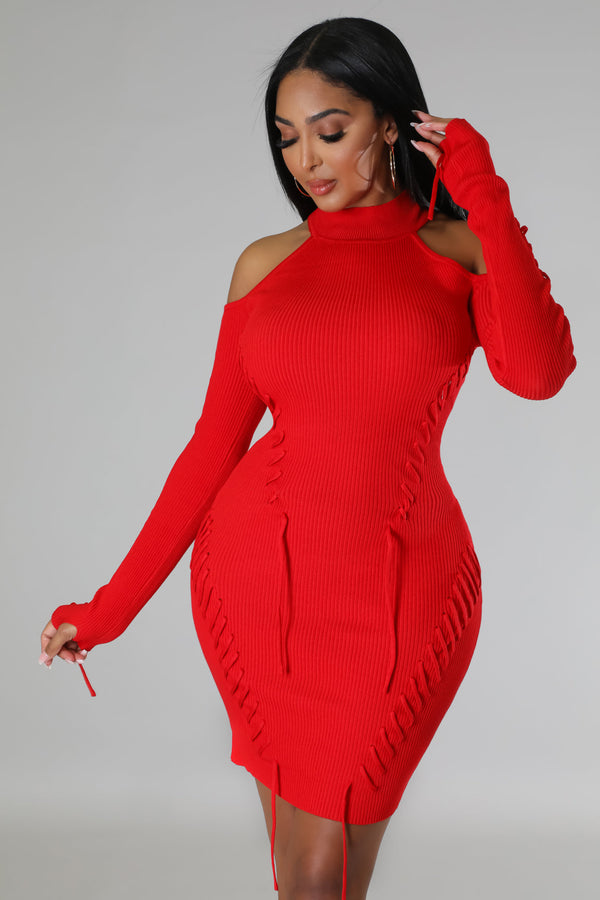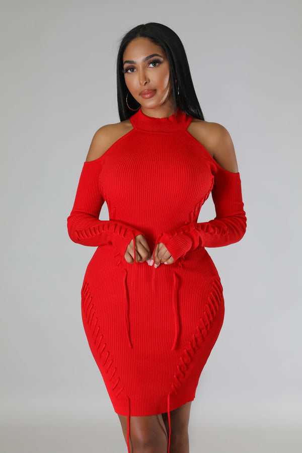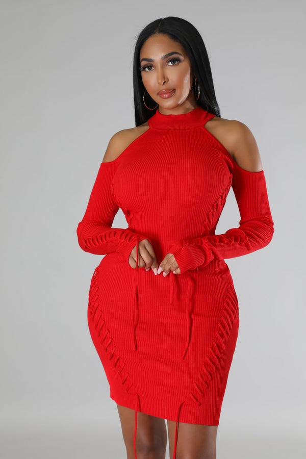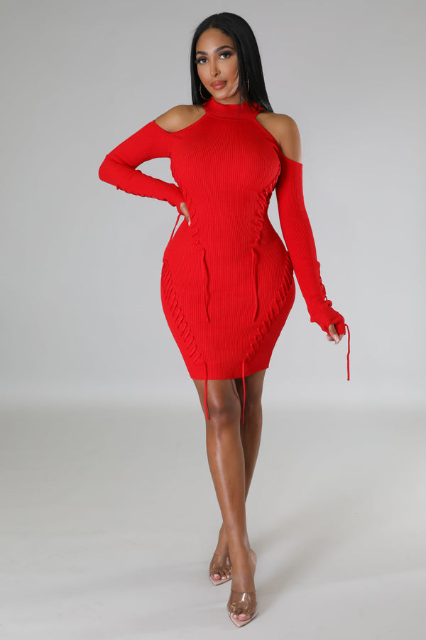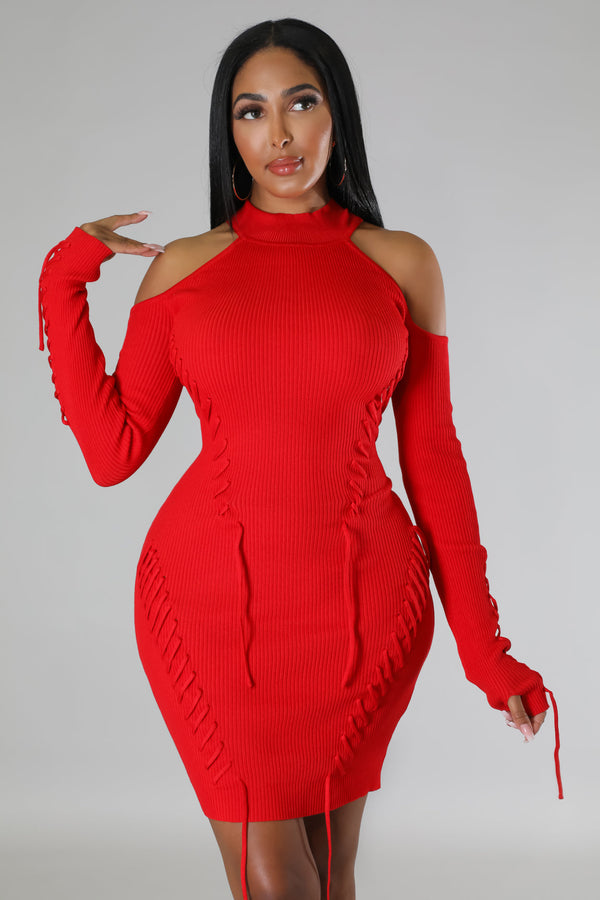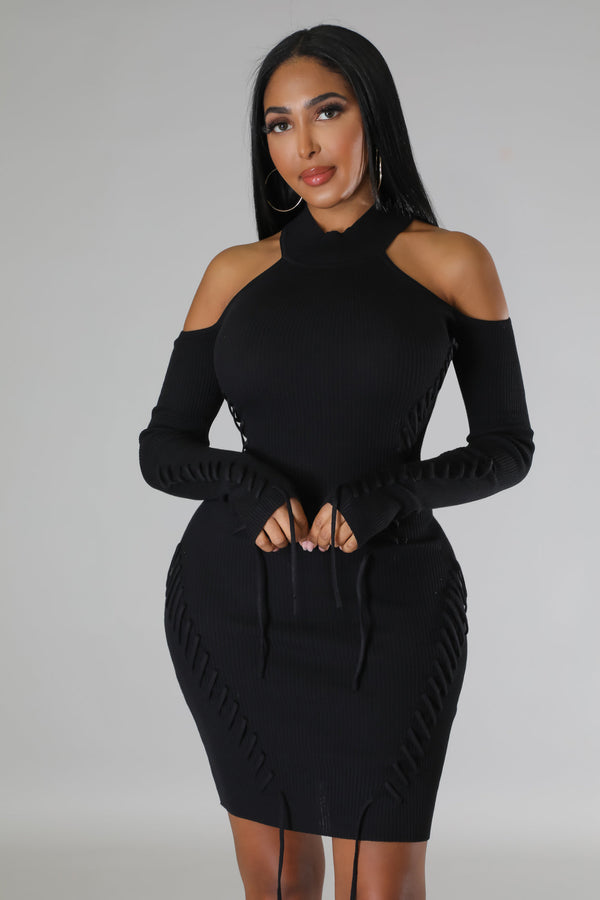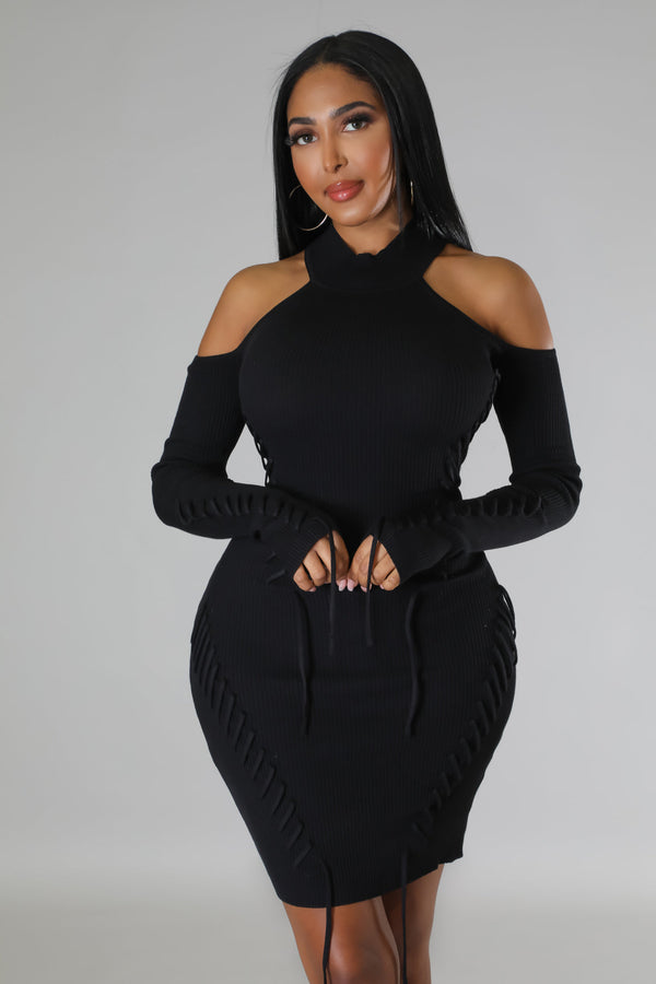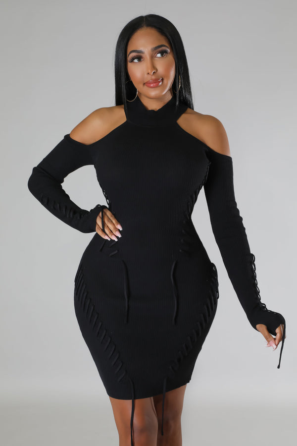 Semi-stretch dress  Round neckline  Long sleeves  Shoulder cutout  Lace up details  Knit  No closure  75% acrylic 25% nylon  Hand wash cold  Model is wearing a small  MODEL STATS Height: 5.6"Bust:32" / Waist:26" / Hips:41"