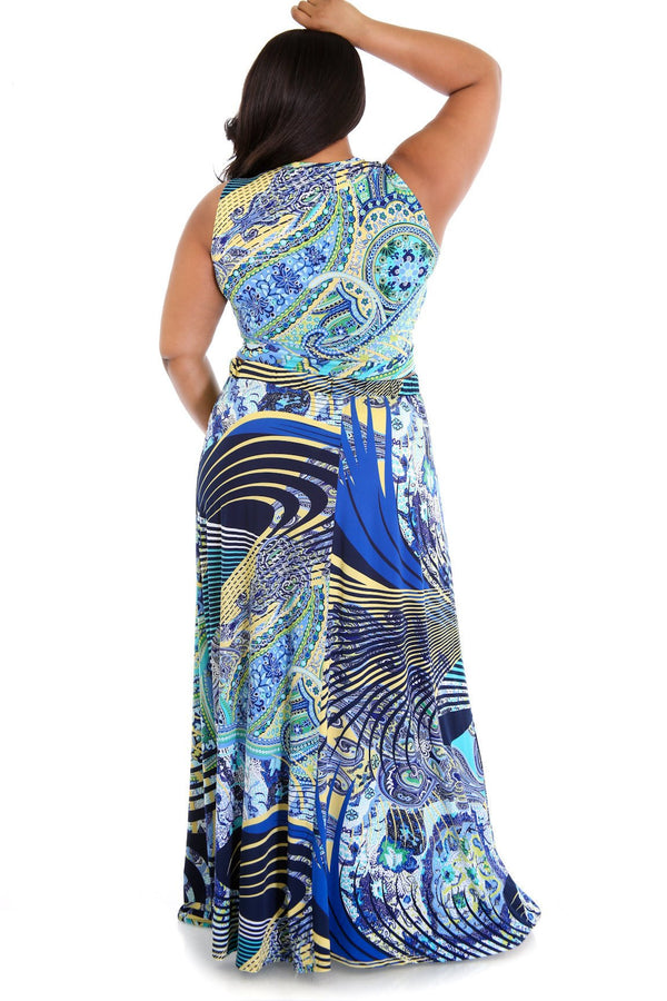Style GT8113P Description This mix of patterns skirt features a smooth stretch fabric. The sleeveless top has a round neckline, a peep hole and a knot accent right below, finished with stitching detail closure. The maxi skirt has a stretchy...