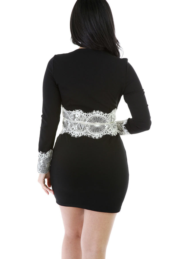 Style wonXA100270EL Description This dress features non stretch material a v-neckline and long sleeves with contrasting color lace cuffs. Full length front zipper with contrasting color lace lines the front of the dress along with a faux zipper detail across...